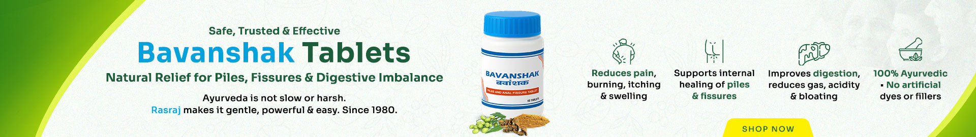 • Bavanshak Tablet is your gentle Ayurvedic support for piles, fissures, varicose veins, and digestive imbalance.